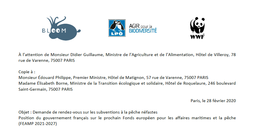 Le 28 février, BLOOM ainsi que la LPO et le WWF ont adressé une lettre commune au ministre français de l’Agriculture et de l’Alimentation Didier Guillaume. Dans ce courrier, nous appelons le gouvernement français à prendre fermement position contre l’introduction de subventions néfastes et sollicitons urgemment un rendez-vous pour détailler cette nécessité.