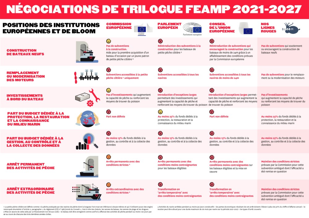 Après plus de trois mois d’arrêt en raison de la crise sanitaire, les négociations politiques de “Trilogue” (entre le Conseil de l’Union européenne, le Parlement européen et la Commission européenne) sur le prochain Fonds européen pour les affaires maritimes et la pêche (FEAMP) ont repris. Malgré la mobilisation des citoyens européens aux côtés de BLOOM sur des lignes rouges clairement identifiées, les institutions européennes s’entêtent à défendre l’indéfendable : la réintroduction des subventions néfastes qui impliqueront mécaniquement une augmentation de la capacité de pêche et, in fine, de la surpêche dans les eaux européennes.